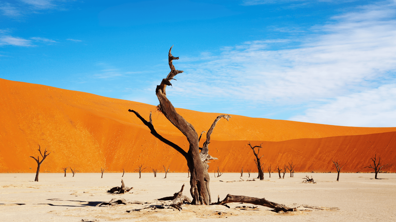 Desert-adapted elephants and lions roam the dry riverbeds of Damaraland and Kaokoland, while Etosha National Park delivers thrilling predator sightings at its shimmering salt pan.